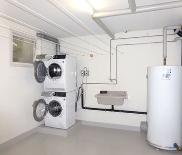 Zwei Balkone. Waschmaschine und Trockner im Gebäude (gege...